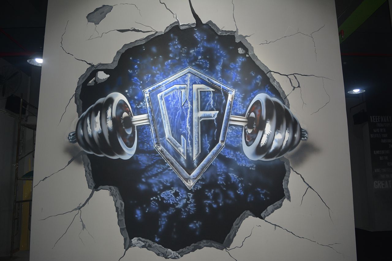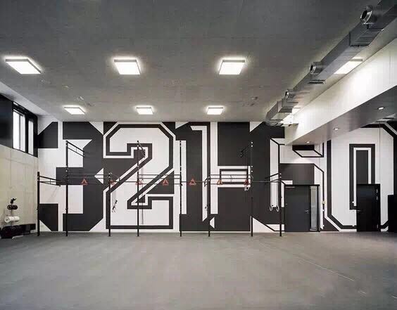 很多健身房做墻體彩繪的時候,會選擇涂鴉、運動等色彩明亮、充滿動感的圖案作為墻體彩繪內容,而案例中的這家健身房,與眾不同地選擇了簡約清新風格的墻繪。每一個健身區域都用簡單明了的線描圖案和文字的結合,對健身內容進行了高度的總結概括,讓人一眼就能看懂。而色彩精簡到只有黑色與白色。整個健身房的設計簡約明快,環境一覽無余,干凈整潔,看起來更高端有氣質。