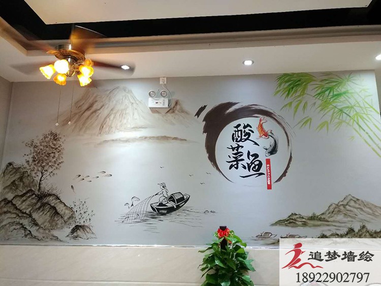 墻繪項目介紹:傳統(tǒng)中國菜酸菜魚配上濃厚的水墨畫風(fēng),讓店鋪增添了色彩的同時,也帶有濃厚的中國味