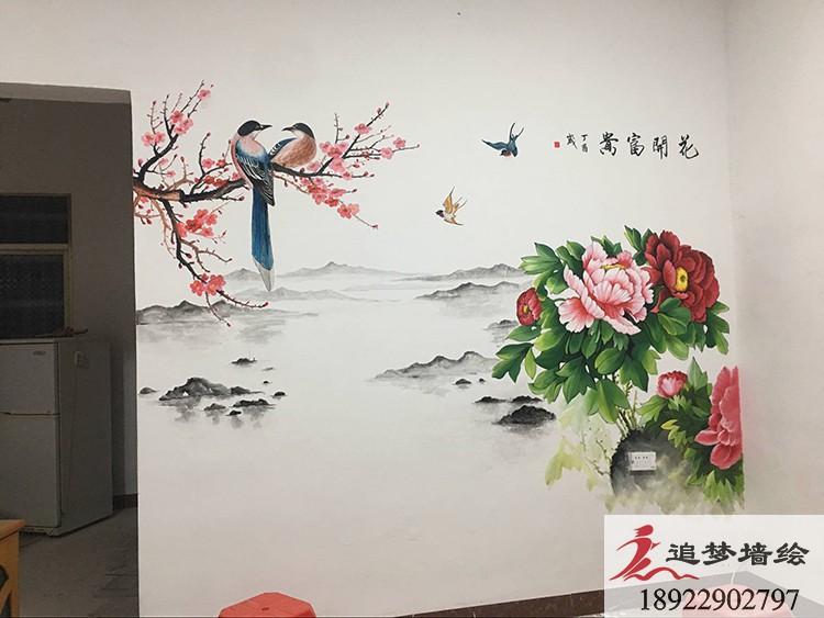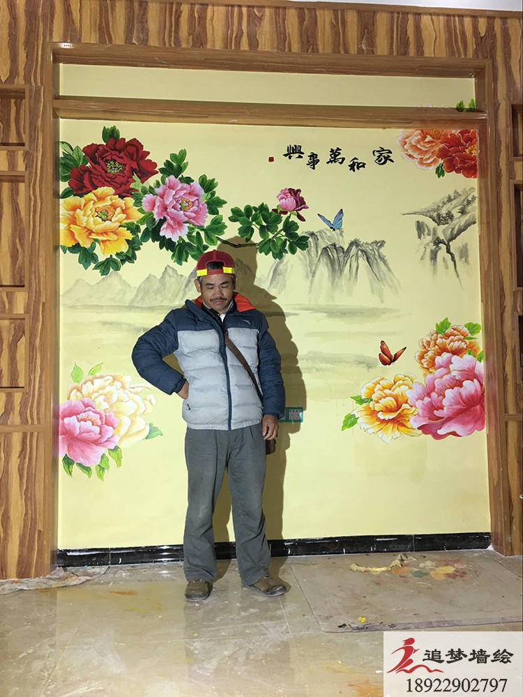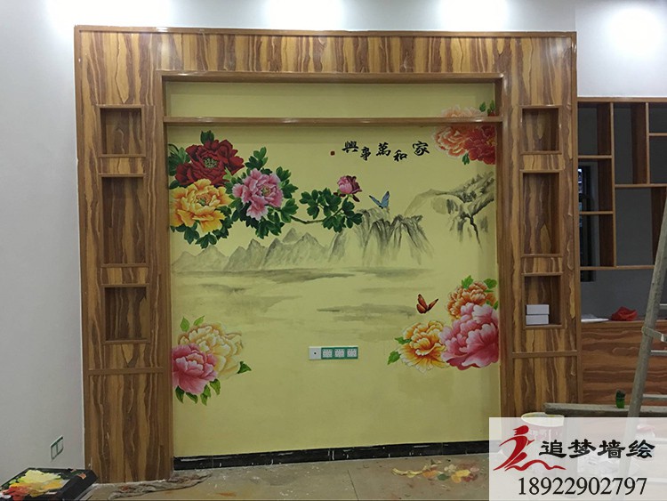 墻繪項(xiàng)目介紹:依據(jù)客戶的需要,我們繪制了在中國代表吉祥富貴的牡丹山水畫,象征著家和萬事興、富貴繁華的韻意。