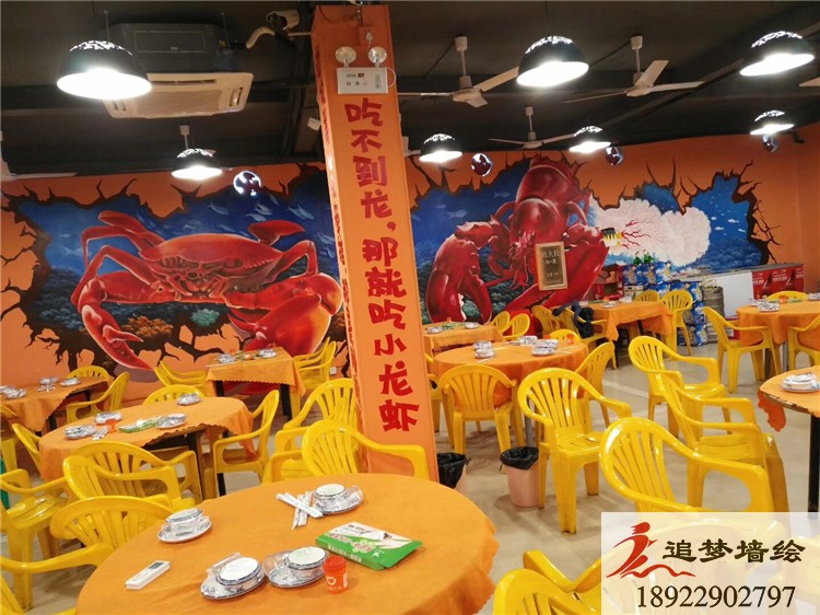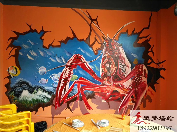 墻繪項(xiàng)目介紹:東莞洪梅蝦蟹墻繪設(shè)計(jì),用到了互動(dòng)性墻繪,運(yùn)用3D立體視覺效果,與網(wǎng)紅墻效果,整體設(shè)計(jì)生動(dòng)形象。,用到了龍蝦與螃蟹的元素,充分體現(xiàn)了食物的美味誘人,得到各領(lǐng)導(dǎo)的認(rèn)可贊許,給追夢(mèng)墻繪很大的鼓勵(lì).