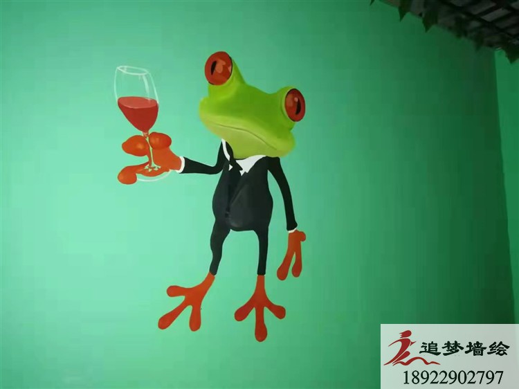 10月中旬我接到一個東莞的客戶要求做墻繪,他說主要是經營與蛙有關的餐廳,如牛蛙火鍋等,想要一些簡潔卡通蛙就好,到時候他還會配一些掛畫。我花了點時間到的現場看一下,大概量了下尺寸,還有拍一些現場圖,然后與客戶聊了一會,問他還有沒有其他的需求,什么時候開業等,確認好后,我回到公司馬上開工。規劃畫10只青蛙,然后各個青蛙動作形態各不同,再給客戶過目后再過去繪畫,因為客戶月底就開業了。客戶確認好沒什么問題了,我們的畫師馬上就到現場去繪畫,一兩天的時間就畫完了。于是各種各樣的有趣躍然墻上,有騎單車的、有拿喇叭喊話的、有手捧鮮花的、有在練習拳擊的等等。