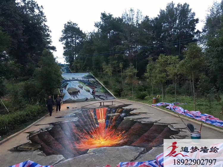 這是福州的一座公園,這里環境優美,適宜休閑玩耍,但卻缺少一些趣味性的東西。園方為了增添活力和趣味,想要做墻繪的東西,但是沒有確切的方向,于是我們為他們規劃好,除了這面很大墻可以畫東西之外,其實還可以在地上畫東西的。于是我們就為他們設計了些3D視覺感比較強的畫面,不用多久這些漁民開船撲魚、火山熔巖、山水瀑布就呈現到墻上和地面了。他們感到很滿意,因為這樣一來不僅風趣了許多,人們還可以結合這些畫面拍出有意思的照片。