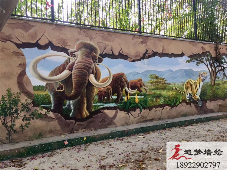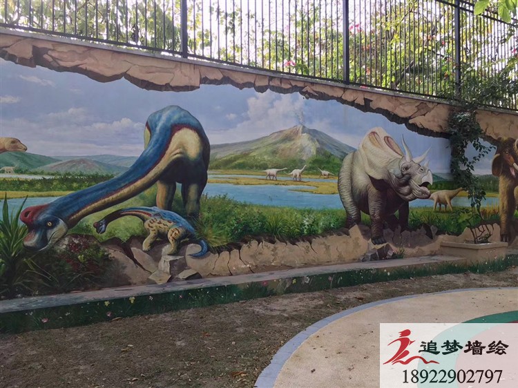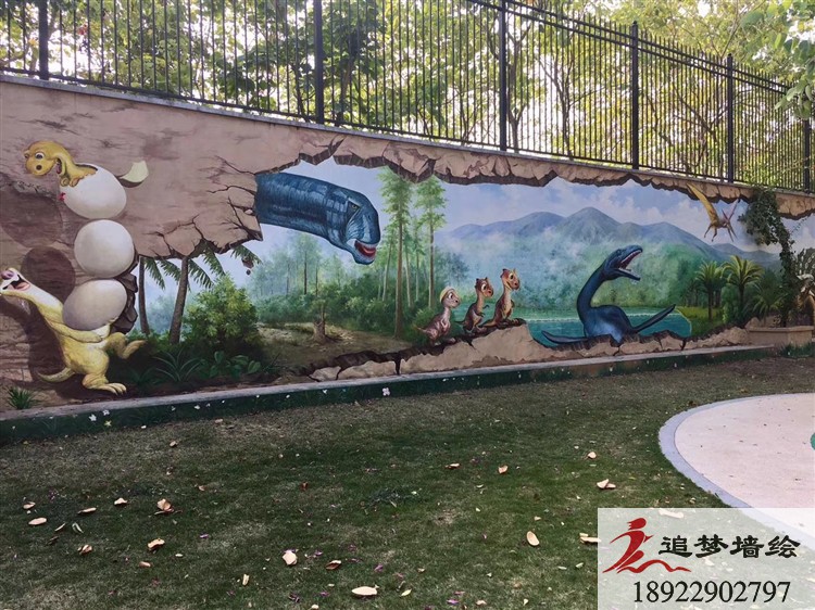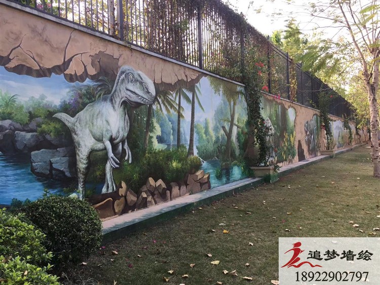 公園墻繪。這次又是公園方面的彩繪,在公園里的一個休閑娛樂的長廊邊上,就是我們這次要畫的“畫布”,園方表示想畫一些有趣的3D動物畫面,于是我們便將《侏羅紀(jì)公園》和《冰河世紀(jì)》的一些畫面給他看,他看到后覺得很滿意,還說可以稍微搞得有創(chuàng)意一些,我們就跟他說可以兩個結(jié)合起來,然后畫成3D效果這樣。很快我們的設(shè)計師就設(shè)計出了一個大概的效果給園方,他說沒問題了,我們就可以施工了。這些霸王龍、翼龍還有冰河世紀(jì)的猛犸象等等畫不是很容易,但畫這些,再在它們的外邊加上墻,3D效果就容易的呈現(xiàn)出來了。