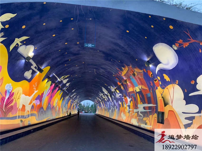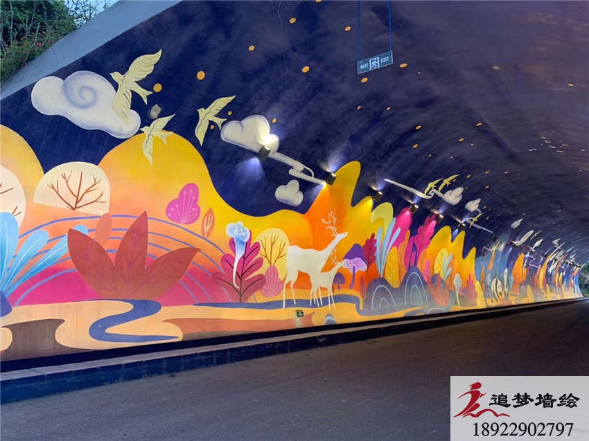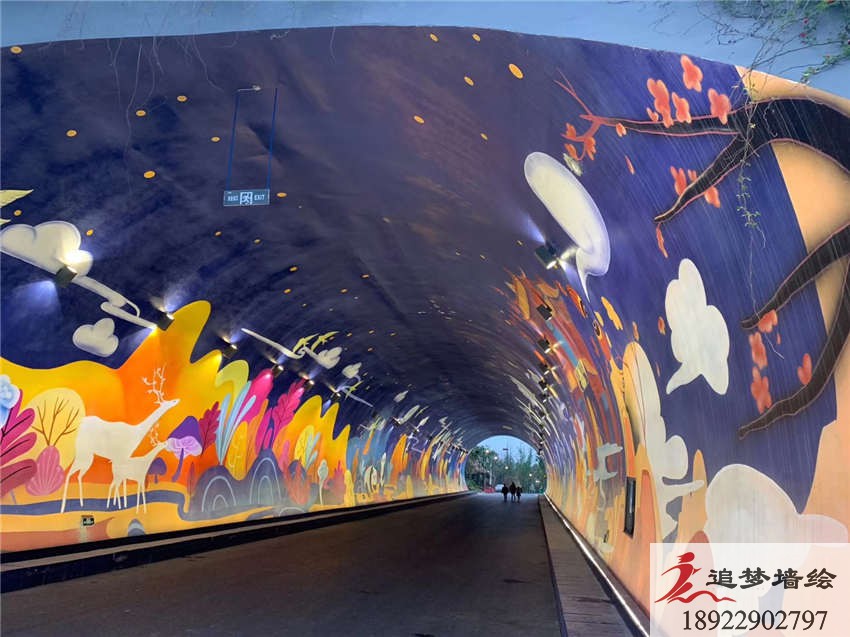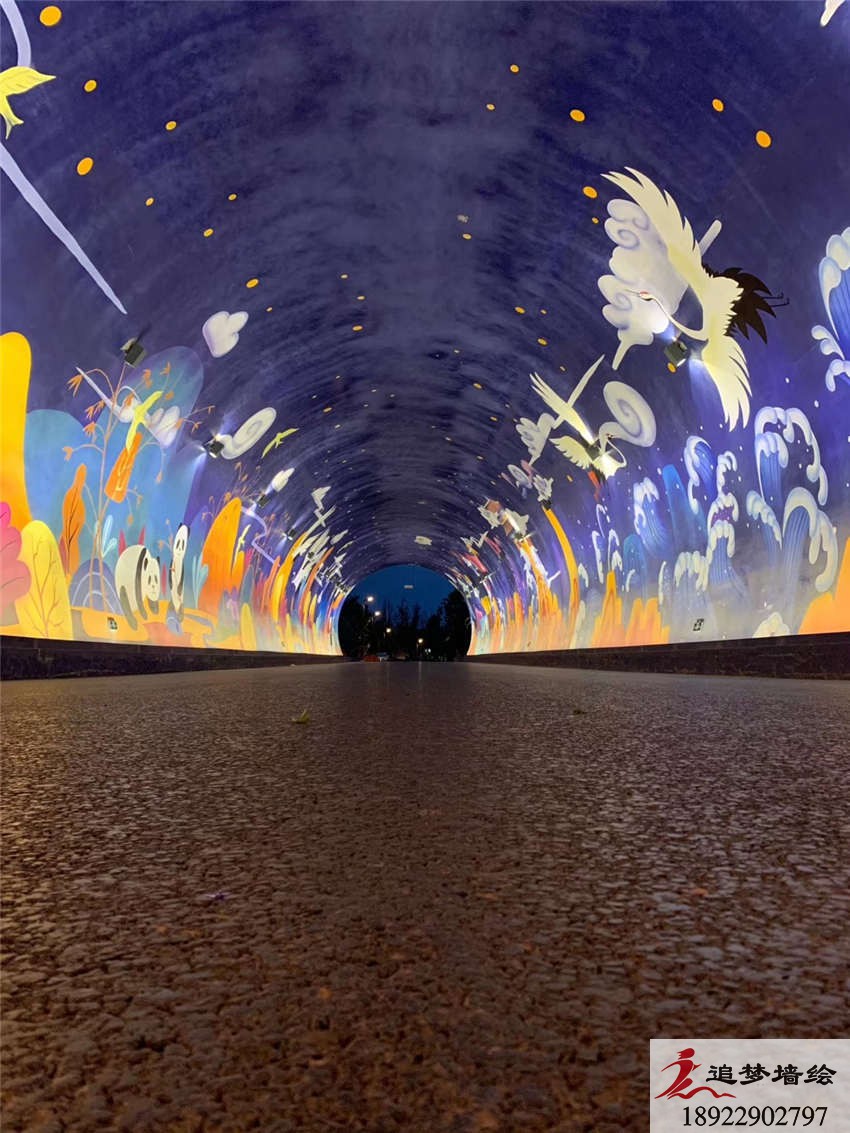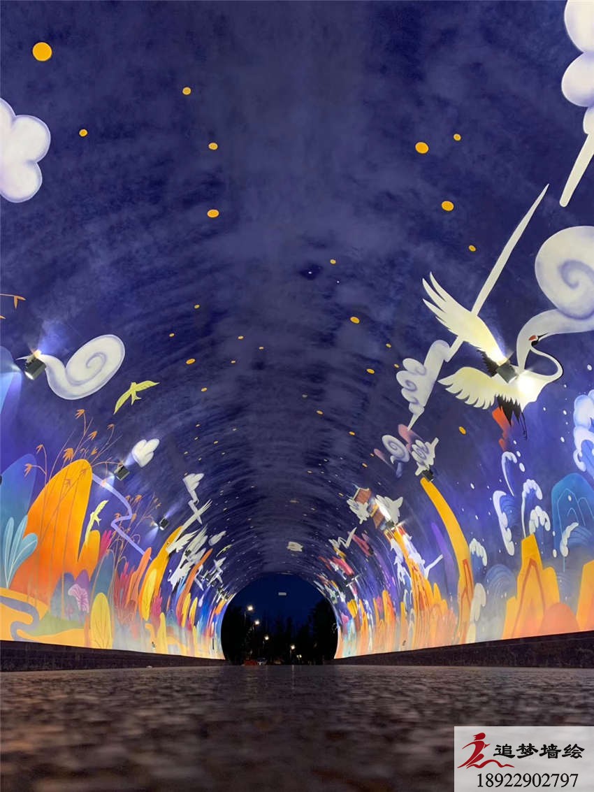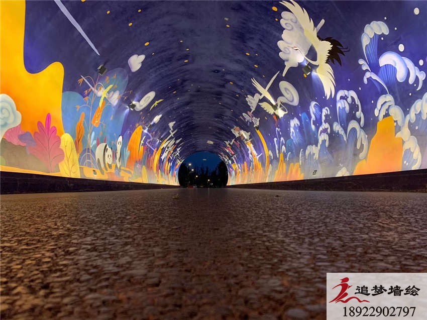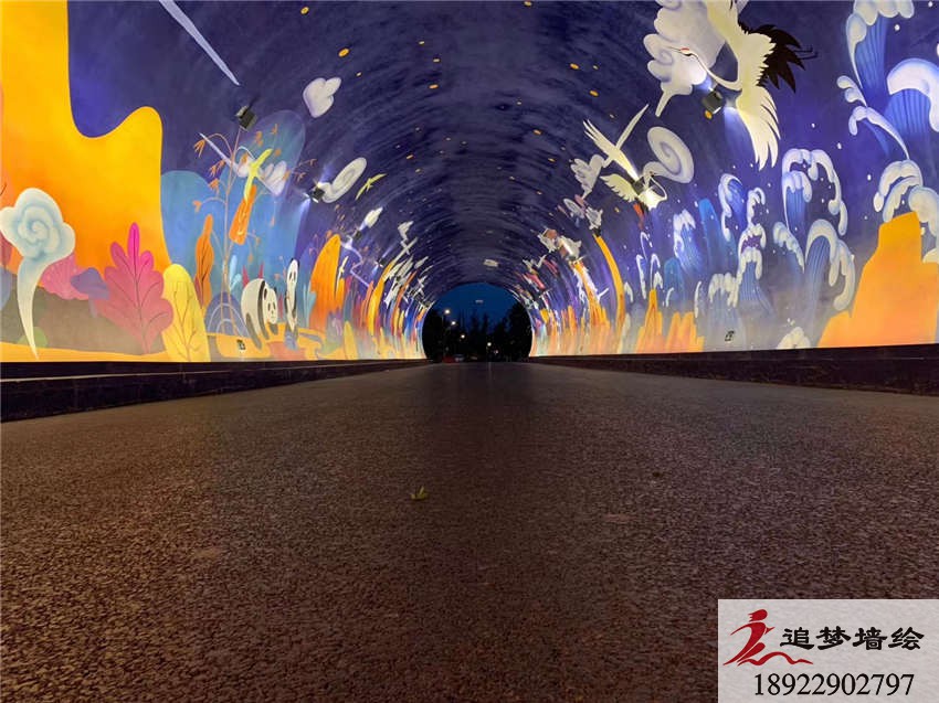珠海隧道彩繪這個項目,我們追夢墻繪一起策劃,設計出比較夢幻的設計方案,以具有夢幻代表性的紫色色調為主,搭配橙色,用各種各樣夢幻的圖案,文字,把畫面做的精彩生動,色調明快,協調統一,仙鶴,云彩,熊貓等圖案都展示了夢幻的內涵!