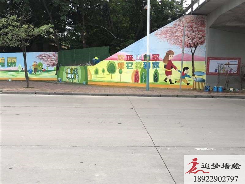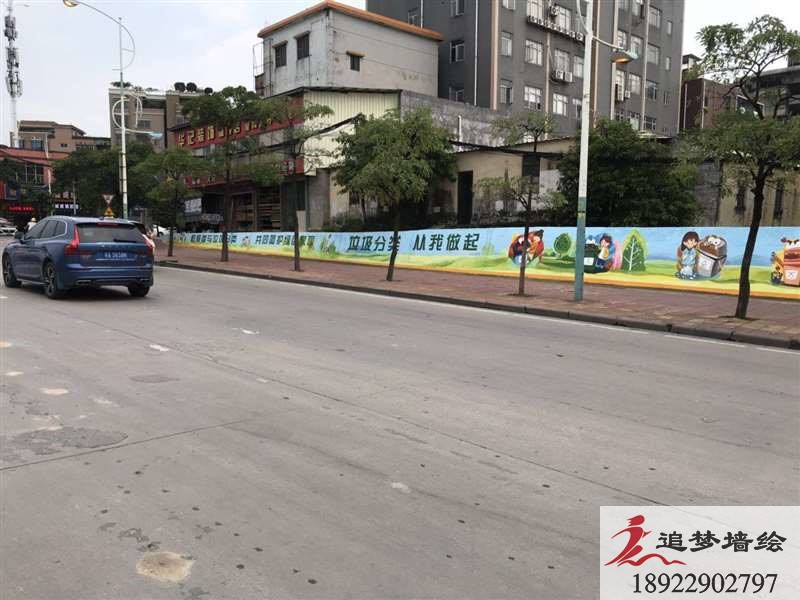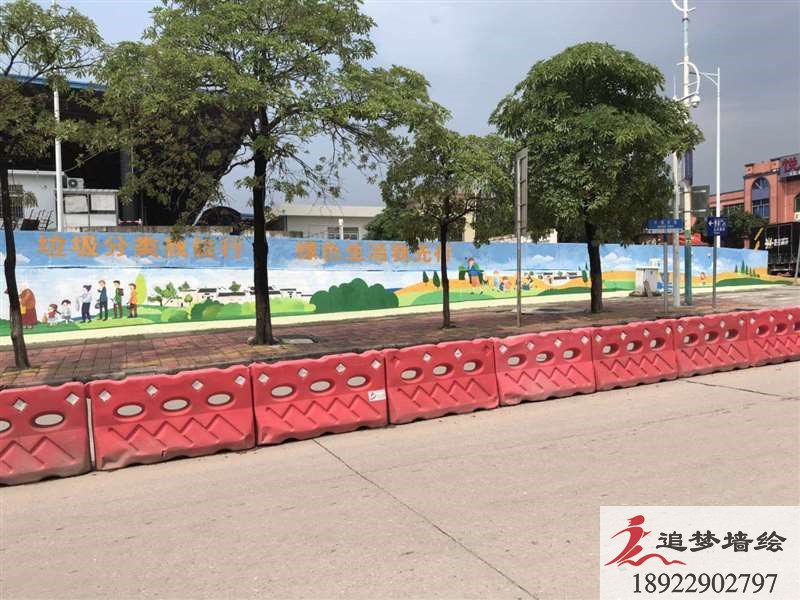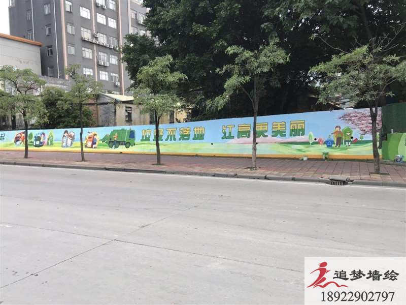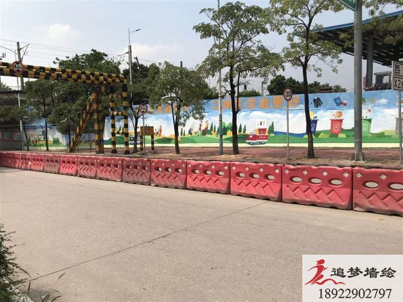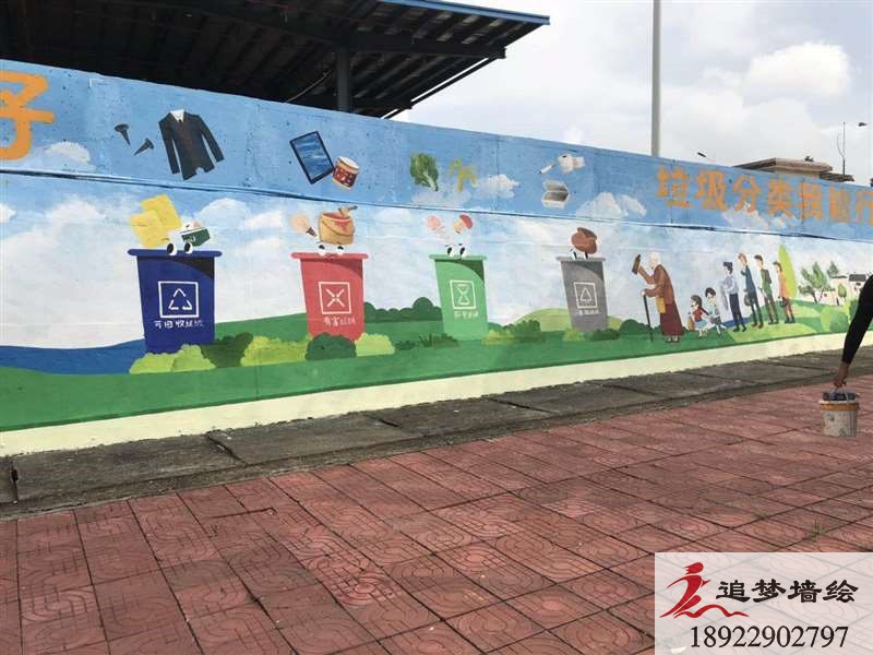 墻繪項目介紹: 江高這個的項目主要繪制彩繪圖案整體設計圍繞“垃圾分類我能行,綠色生活”主題,突出美化環境的主題。圖案是以可愛的卡通戶外青山人物與色塊相比較的垃圾分類桶為主,采用圖文結合的表現形式。墻繪整體基調可愛、有趣,突出了垃圾分類的主題。