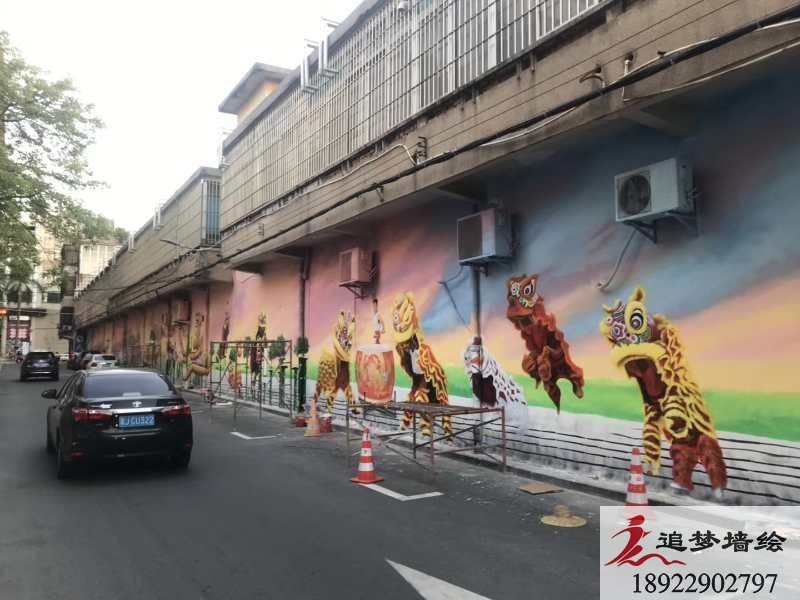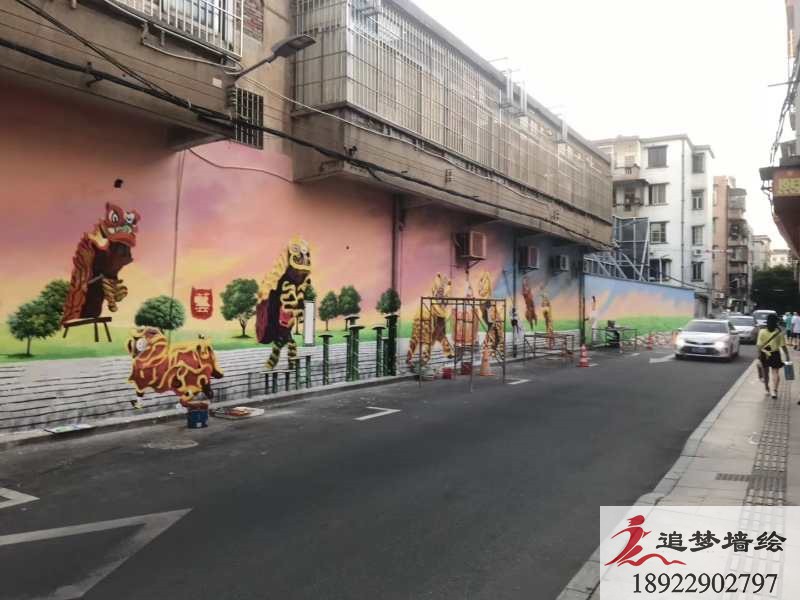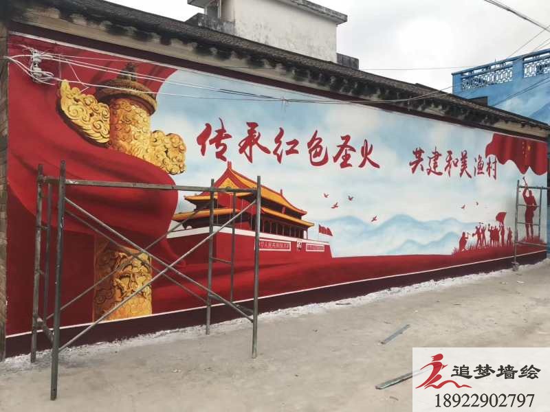 墻繪項(xiàng)目介紹: 海珠這次的項(xiàng)目主要繪制彩繪圖案整體設(shè)計(jì)圍繞鄉(xiāng)村振興戰(zhàn)略為主題,又要突出黨建的主題。圖案是以鄉(xiāng)村氣氛為主的舞獅,荷花,采用圖文結(jié)合的表現(xiàn)形式,突出了自然、又以北京天安門和黨相關(guān)的元素展示黨建文化。墻繪整體基調(diào)樂(lè)觀積極向上。