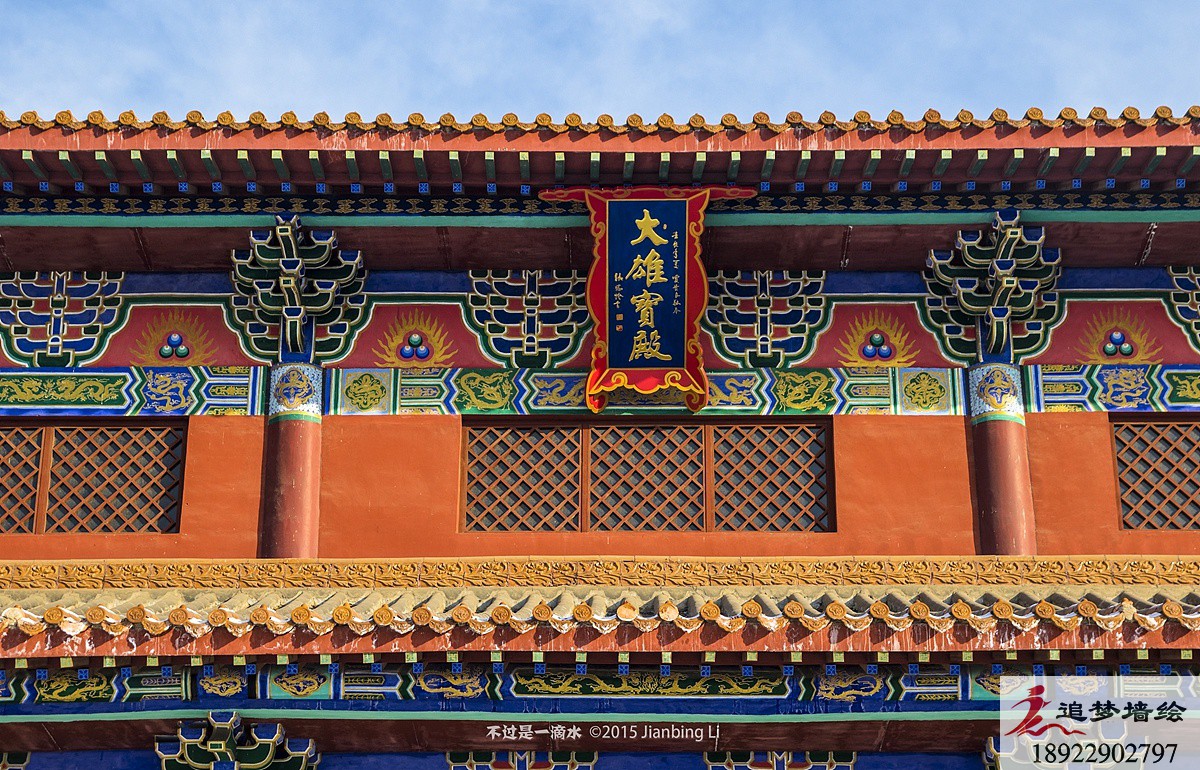 墻繪項目介紹: 這個項目的彩繪方式是和璽彩繪,金鳳和璽彩畫是建筑常見而重要的裝飾手法。它構圖嚴謹,圖案復雜一般只用于宮殿、壇廟等大建筑物的主殿,和璽彩繪表現了先進的營造技藝,又蘊涵著深厚的文化底蘊, 具有極高的美學價值、學術價值和使用價值。