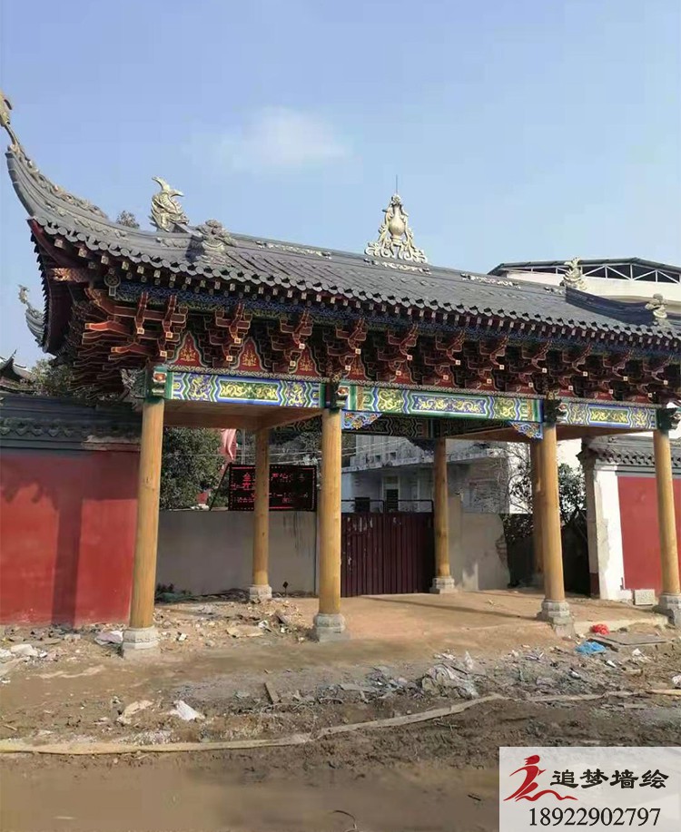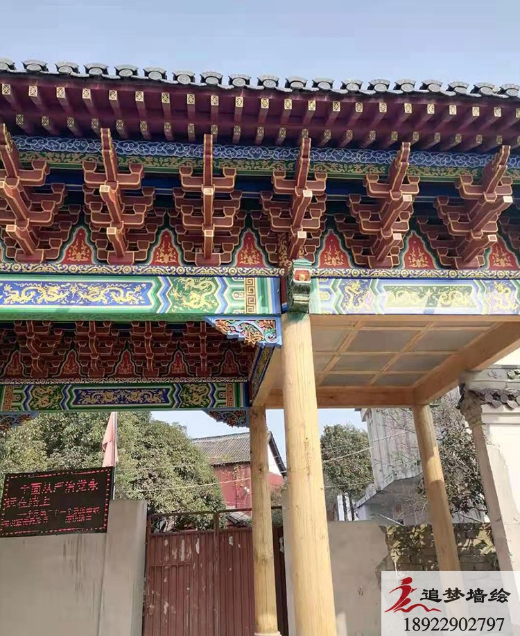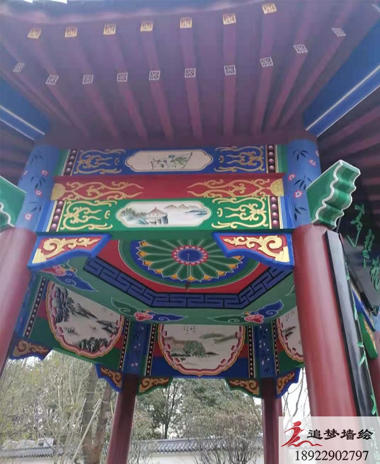 墻繪項目介紹: 這個項目的古建筑彩繪是根據嶺南文化進行彩繪圖案設計。是由蘇式、旋子、和璽彩畫融合而成的彩繪效果與其他古建筑彩繪風格大致一致,卻體現了當地特色習俗與審美。用豐富色彩把畫面做的精彩生動,色調明快,協調統一,具有地方特色。