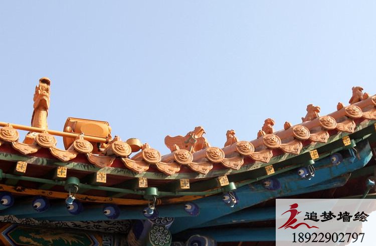 墻繪項目介紹:這個項目的彩繪方式是旋子彩繪,可以根據(jù)不同要求做的很華貴或很素雅。這種彩繪用途及廣,一般官衙、廟宇、牌樓和園林中都采用。把畫面做的精彩生動,色調明快,協(xié)調統(tǒng)一,展示了符合古人祭祀場景自然氣息的內容。