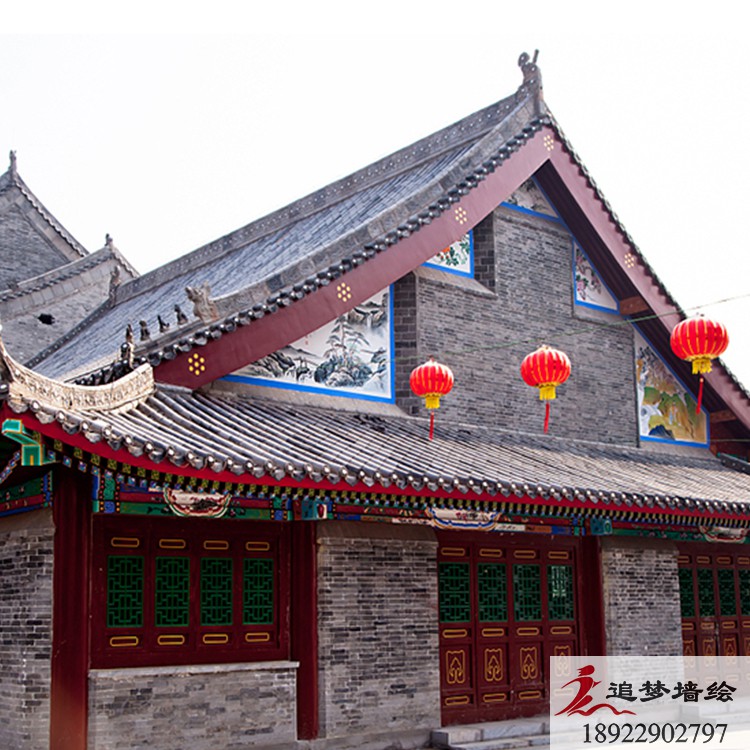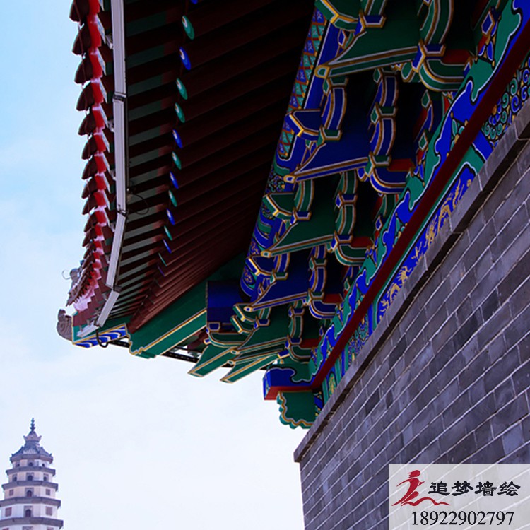 墻繪項目介紹:這個項目是根據嶺南文化設計房子的屋檐,屬于地方彩繪,地方彩繪是根據國內局部地方習俗審美的一種彩畫技術,多由蘇式、旋子、和璽彩畫演變而成。其美觀程度與其他彩繪效果大致一樣,卻體現了當地特色習俗與審美。