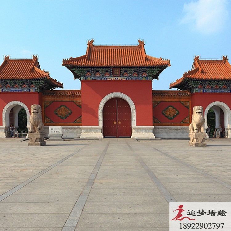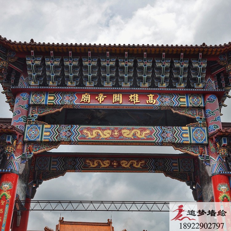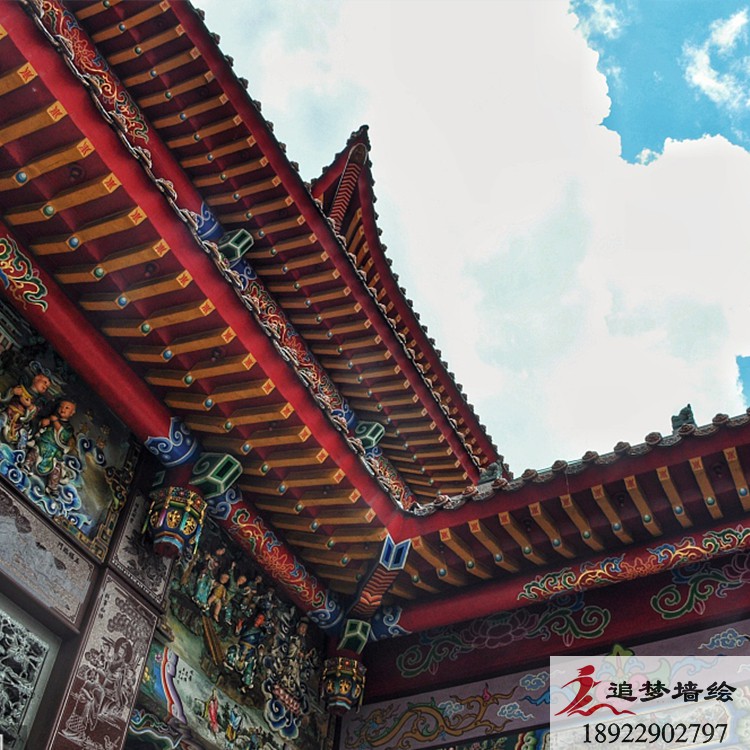 墻繪項目介紹: 這個項目的古建筑彩繪是根據嶺南文化進行彩繪圖案設計。是由蘇式、旋子、和璽彩畫融合而成的彩繪效果與其他古建筑彩繪風格大致一致,卻體現了當地特色習俗與審美。用豐富色彩把畫面做的精彩生動,色調明快,協調統一,具有地方特色。