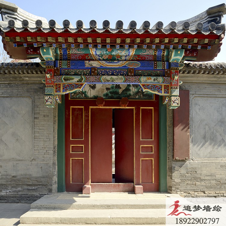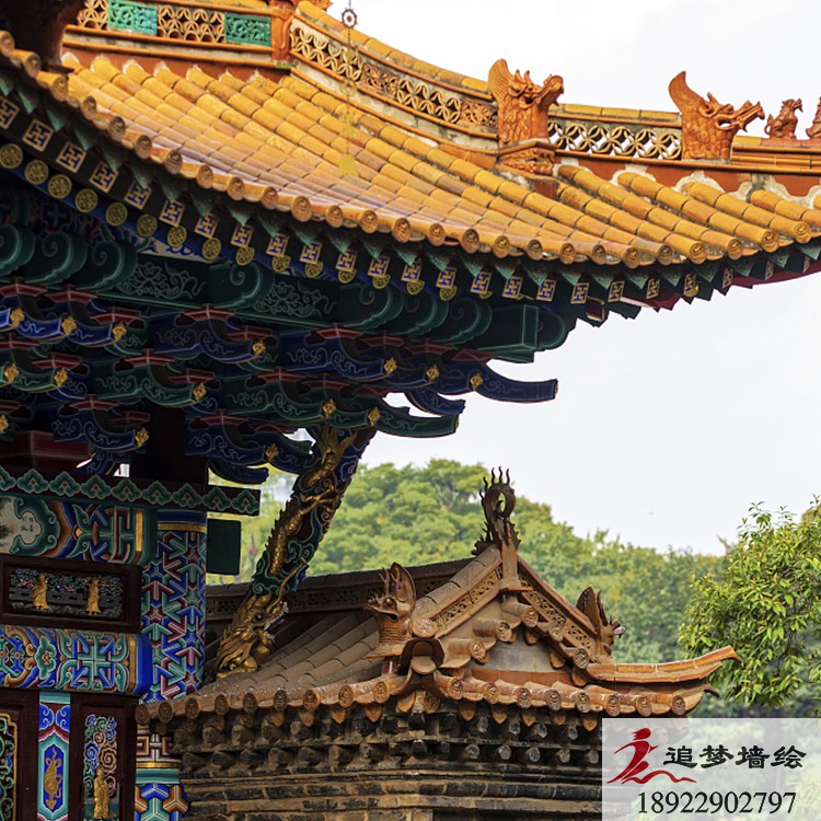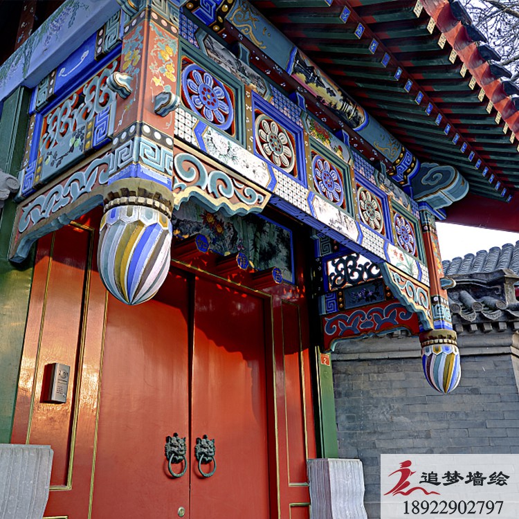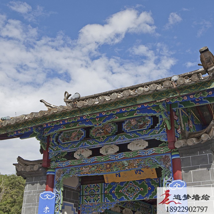 墻繪項目介紹: 這個項目的古建筑彩繪是根據嶺南文化進行彩繪圖案設計。是由蘇式、旋子、和璽彩畫融合而成的彩繪效果與其他古建筑彩繪風格大致一致,卻體現了當地特色習俗與審美。用豐富色彩把畫面做的精彩生動,色調明快,協調統(tǒng)一,具有地方特色。