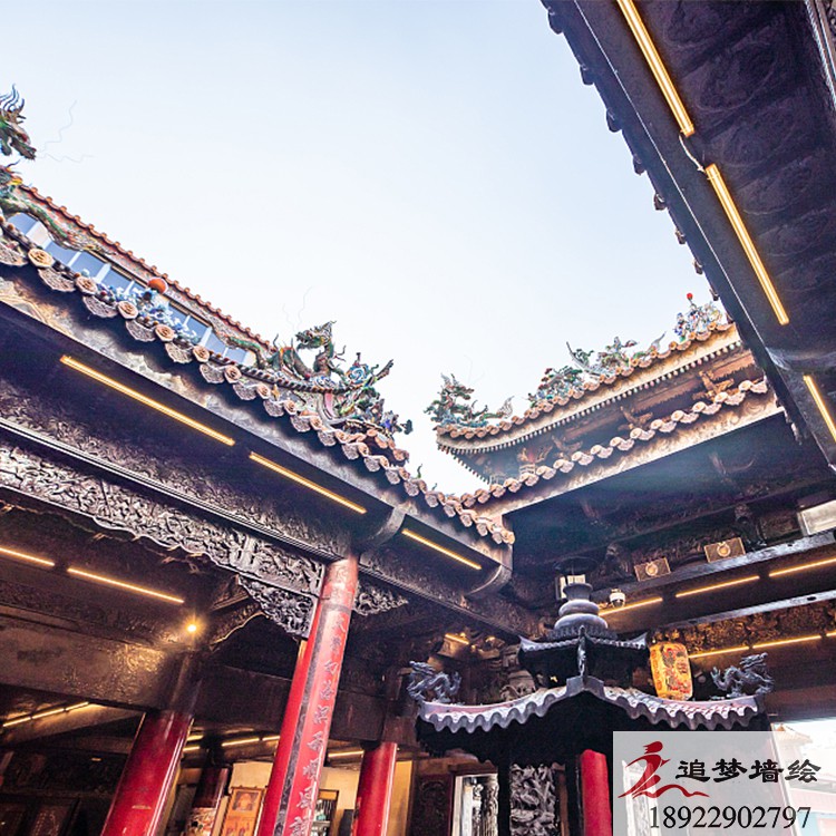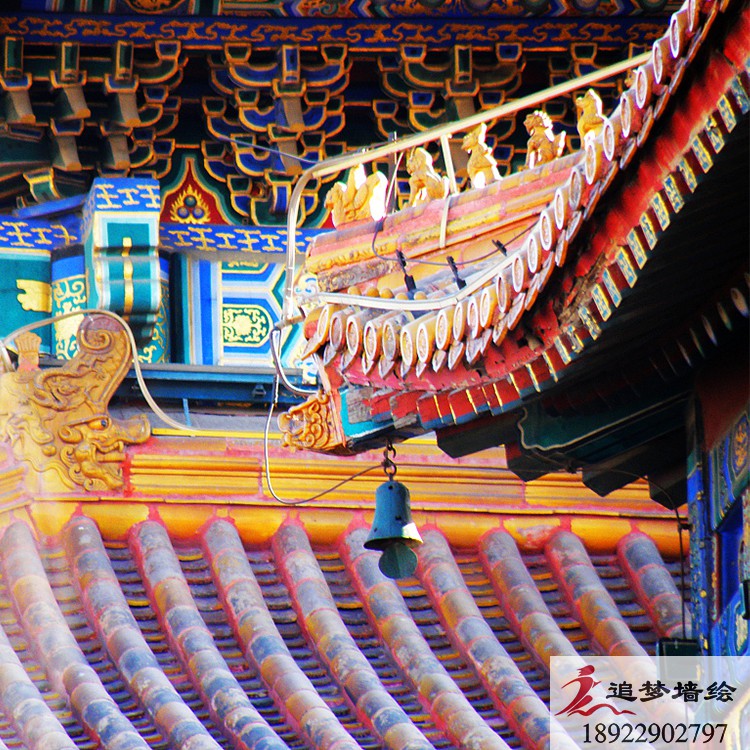 墻繪項目介紹: 這個項目的古建筑彩繪是根據嶺南文化進行彩繪圖案設計。是由蘇式、旋子、和璽彩畫融合而成的彩繪效果與其他古建筑彩繪風格大致一致,卻體現了當地特色習俗與審美。用豐富色彩把畫面做的精彩生動,色調明快,協調統一,具有地方特色。